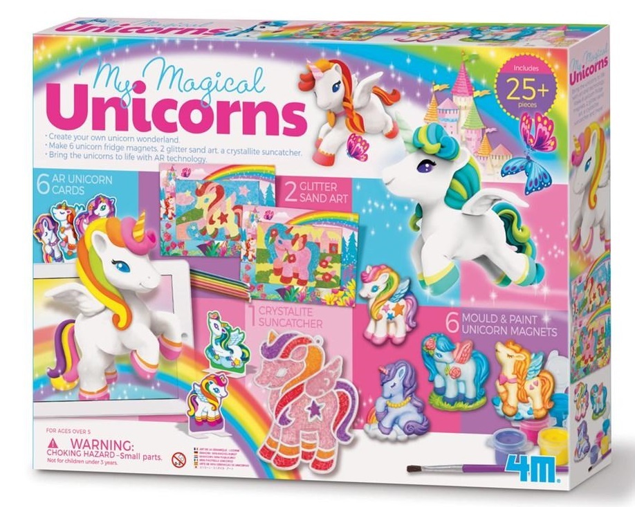 Create your own unicorn wonderland. Make 6 unicorn fridge magnets, 2 glitter sand art and a crystalite suncatcher. Bring the unicorns to life with AR Technology.