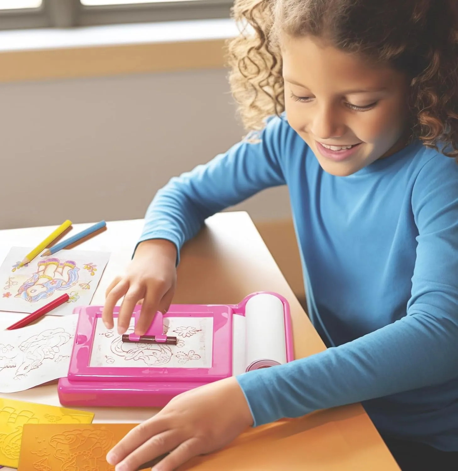 Create an artistic unicorn scene by rubbing crayon over the unicorn art pieces! Change the plates and roll the paper out to make a continuous scene or tear off each scene to have individual unicorns.