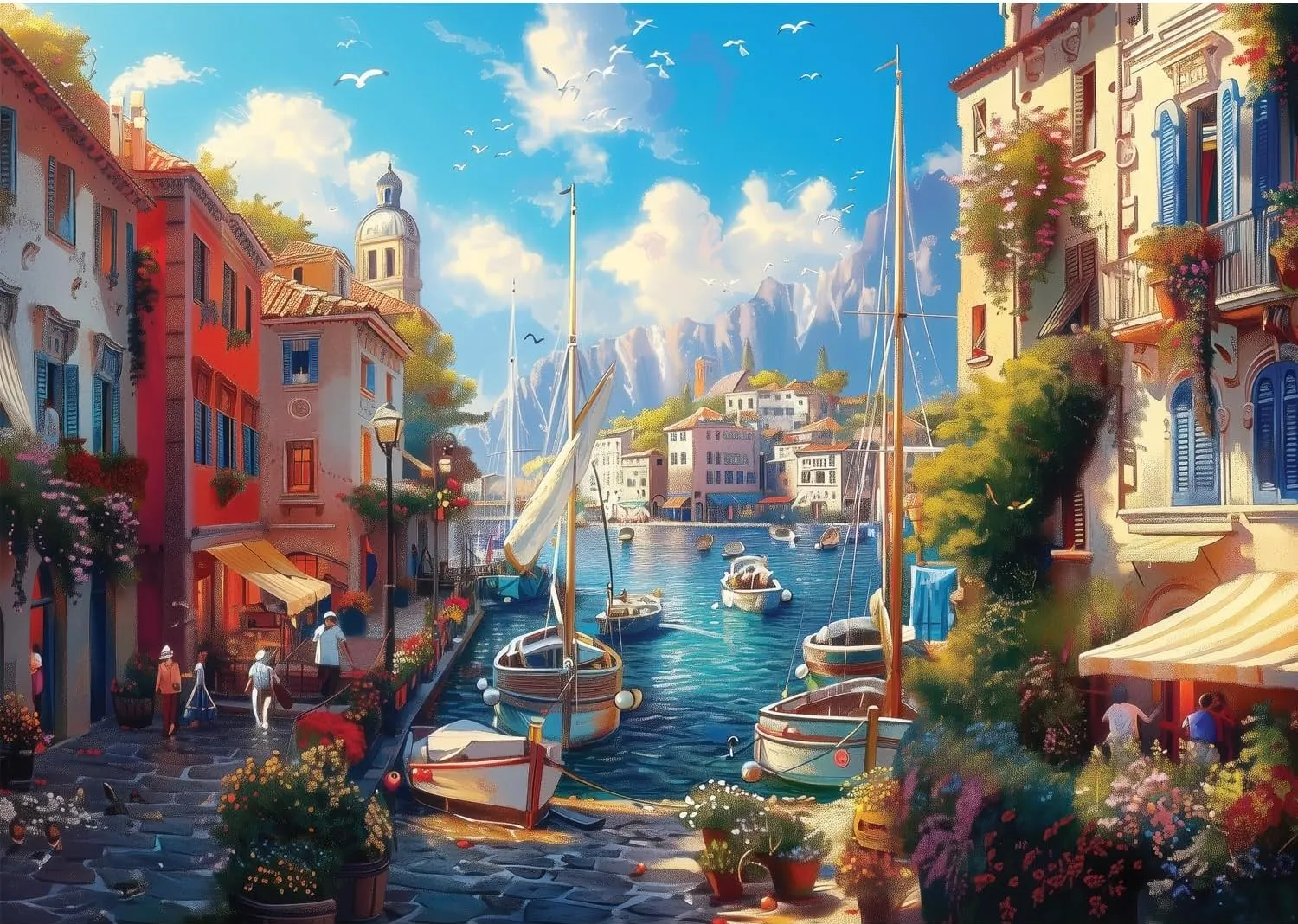 Harbour boats and sailboats line a peaceful street in this breezy 1500-piece jigsaw puzzle of summer joy. Gentle waves and sunny vibes fill every corner with calm delight.