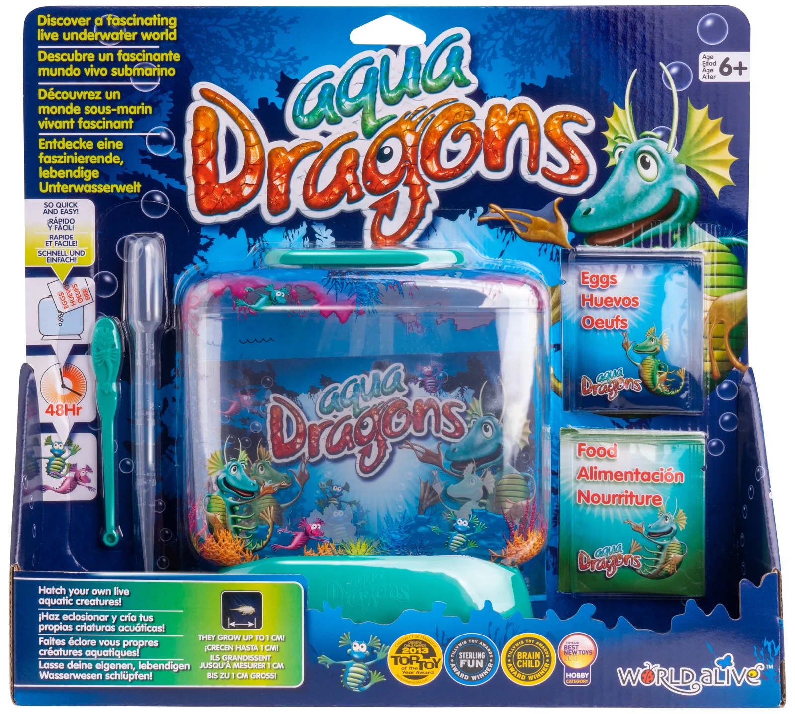 This kit includes a double sided illustrated fish tank, eggs and food packets, feeding spoon, aerator, instructions and activity book.