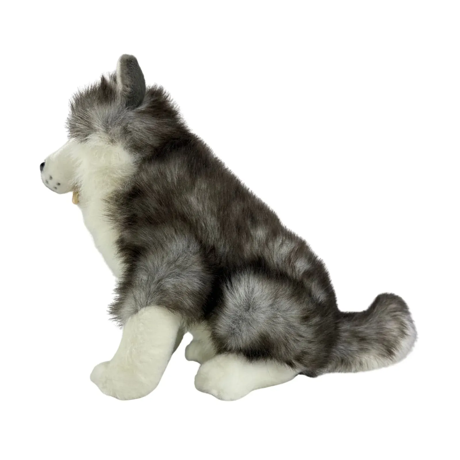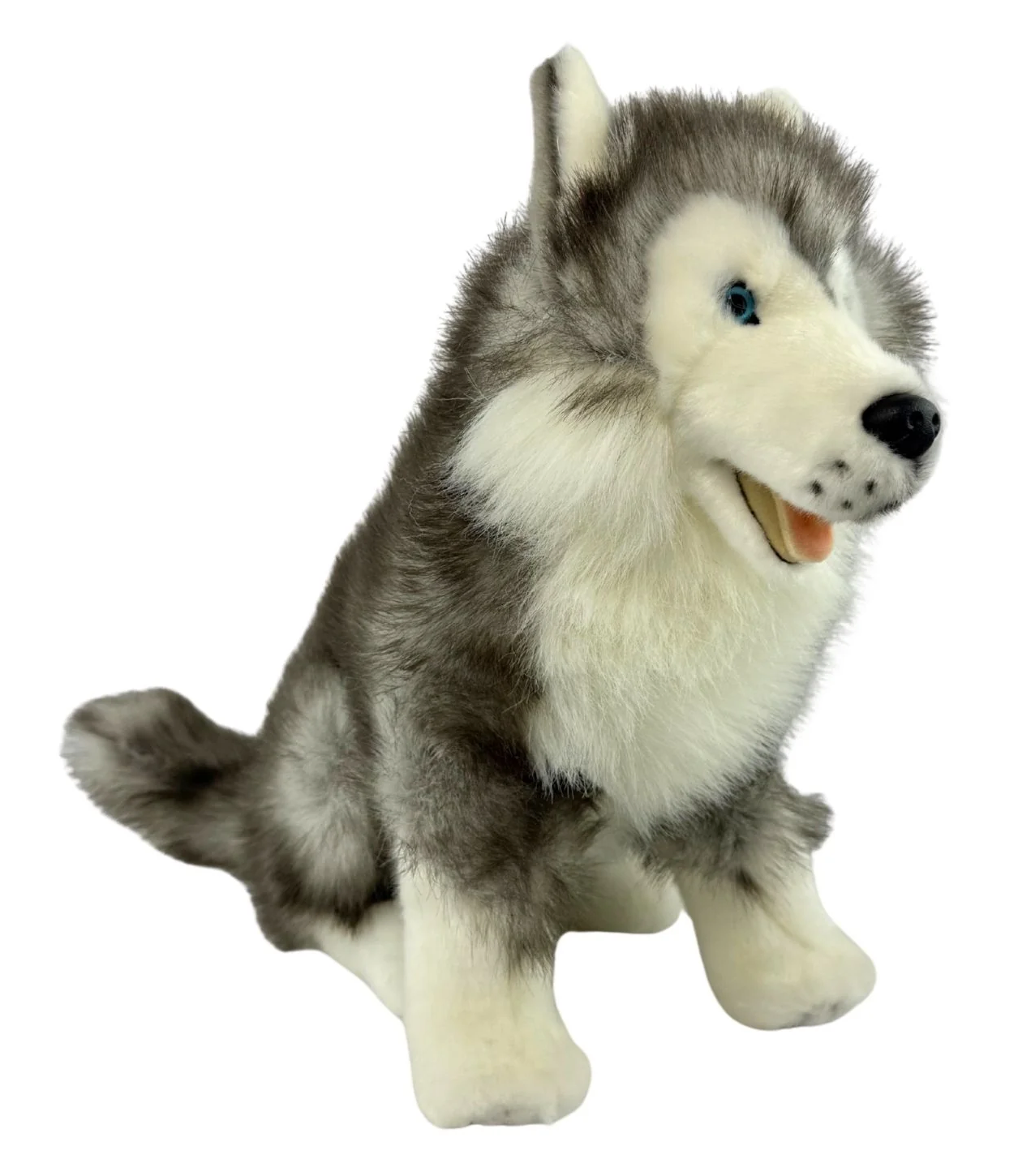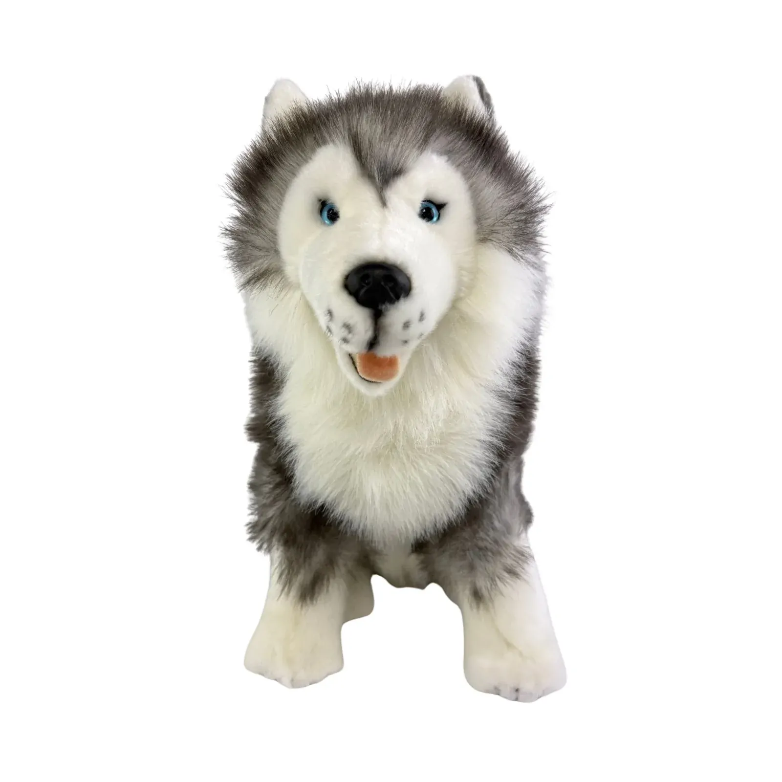 Brock is a quality made sitting realistic almost lifesize stuffed plush husky. The Siberian Husky which are known as sled dogs are an outgoing, alert, intelligent, friendly and gentle dog. His measurements are 35cm from the ground to the top of the head and 29cm from his nose to end of the torso not including tail or 40cm with tail