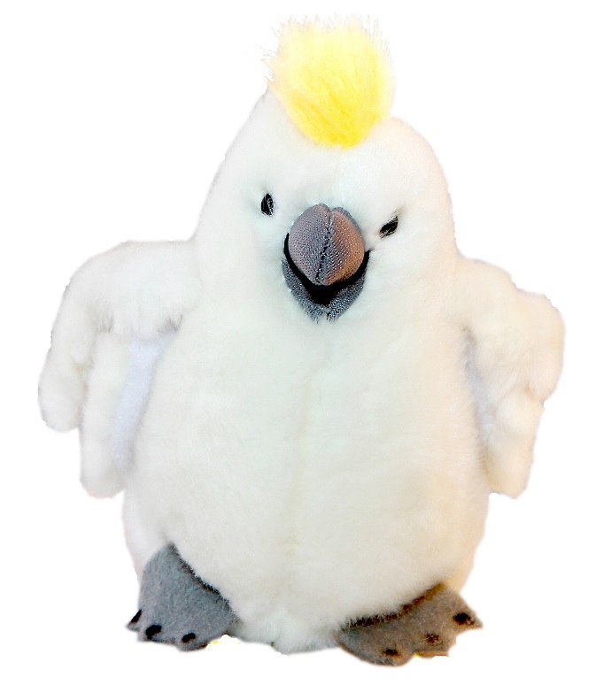 This mini sulfur crested cockatoo is a small realistic Australian souvenir plush toy and an ideal size for children to gift. Cockatoos are parrots and this white cockatoo with a bright yellow mohawk is soft and cute and measures 12cm in height and 7cm in width.