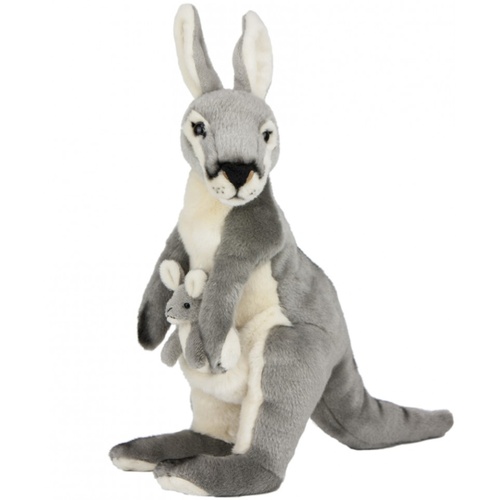 Trudy is a large grey kangaroo with an attached joey souvenir plush toy. This grey kangaroo is known as the eastern grey kangaroo, great grey kangaroo and forester kangaroo. They have been timed at 64 kph and can leap over 9 metres long and 1.8 metres high. Both the grey kangaroo and the emu can’t walk backwards, which is why they are on the Australian Coat of Arms. This kangaroo is soft with hand airbrushed details and measures 44cm in height to the top of the ears and 24cm in length not including tail or 40cm including tail and 18cm in width.