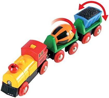 If you’re looking for a new set of wheels for your railway, you’re in the right place. This battery powered train set is extra fun with a moving coal wagon and a rotating cement mixer as well as headlights that light up on the engine.