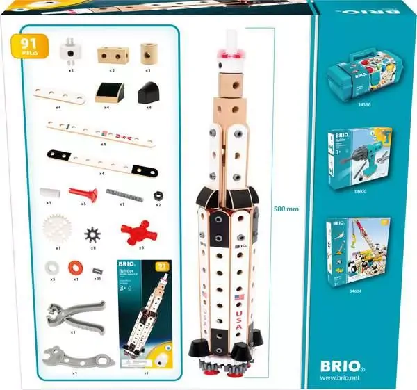 The BRIO Builder Apollo Saturn V set includes 91 pieces: 12x Wooden Bars, 11x Wooden Blocks, 9x Cogwheels, 5x Nails, 1x Light Unit, 1x Pliers, 1x Spanner, multiple play pieces and 1x Inspiration Leaflet.