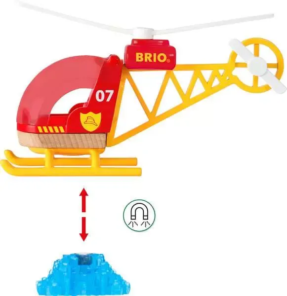 The Large Spiral Set contains 73 pieces: 32 x Modular Supports, 30 x Wooden Rails, 1 x Long Red Bridge, 1 x Battery Powered Locomotive, 1 x Freight Wagon, 1 x Water Load, 1 x Helicopter, 1 x Firefighter Figure, 4 x Firefighter Accessories, 1 x Firefighter Shield.