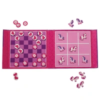 Perfect for travel this fold-up magnetic game is perfect for kids on the go. Includes everything needed for 2 classic games - Tic Tac Toe and Checkers with fun Unicorn design.