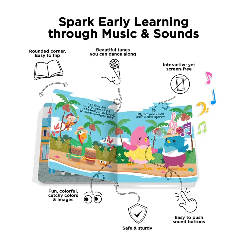 Ditty Bird books have been specifically designed to promote language skills, auditory development and music appreciation. Each book features curved corners for safety, bright colourful illustrations and children can work their fine motor skills through the engaging sound buttons. Wonderfully sturdy, these board books can be read over and over again providing easy to turn pages for little hands.