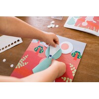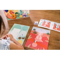 Contents: 4 illustrated cards, 6 sheets of pre-cut illustrated paper circles, 5 googly eyes, and 1 sheet of double-sided adhesive stickers.