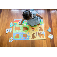 Each animal in this giant farm puzzle has a tactile piece to develop a childs tactile senses. Feel the chickens feathers, pat the bunny's fluffy tummy! The colourful, high gloss images are printed onto durable 2.5mm card-stock. Puzzle pieces are chunky and over-sized and come nicely packaged in a re-usable storage box, making a delightful pre-school age children's gift. Features 8 farm animals. Dimensions 70x50cm.