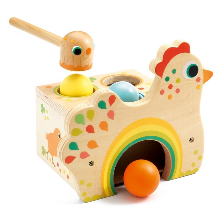 Tap the mother hen’s coloured eggs with the hammer and they emerge from her tummy. Great for developing coordination and introducing cause and effect.