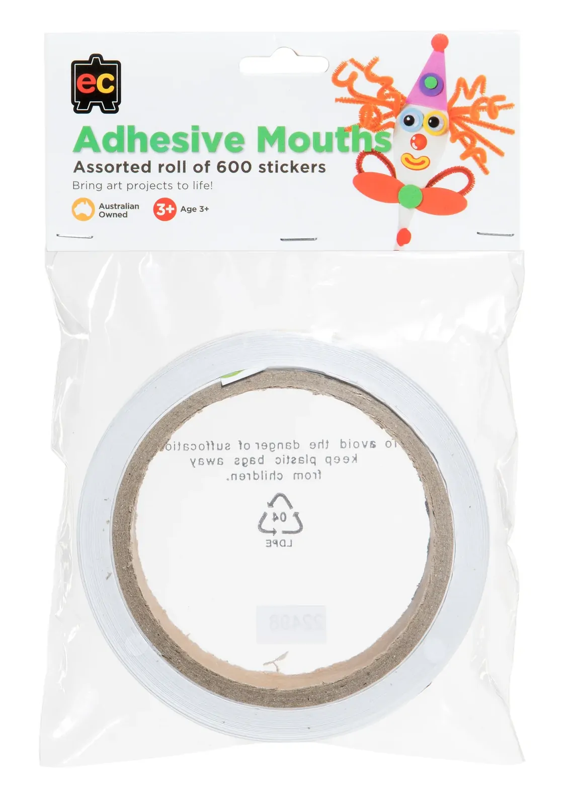 Easy to use mouth stickers on a roll. 6 assorted designs measuring approximately 15mm. Perfect for adding character to craft projects. Roll of 600.
