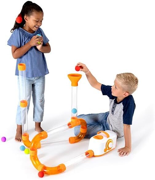 Arrange the tubes and connectors in any way you can imagine. Create loops and swirls. Weave them under tables and over desks. Then, switch on the turbine and let the experimentation begin... Can you make the foam balls leap from one tube to the next, or hover in mid-air, or go around and around in an endless cycle? Or, what happens when you set it to low speed vs high speed? What happens when you load the tubes with all the balls, then turn it all the way up? With hours of runtime and loads of balls, tubes, connectors, and accessories included, kids (and adults) will never want to stop exploring!