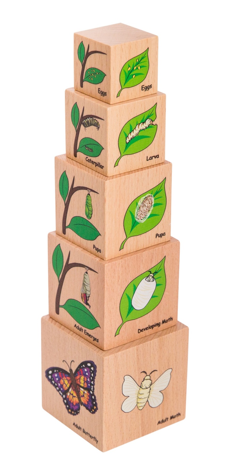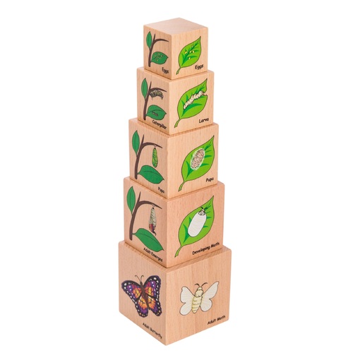 These lifecycle blocks are thoughtfully designed to represent animals and insects that the children may be familiar with. The blocks wonderfully illustrate the lifecycle of a moth, butterfly, chicken and frog. Children can see how the animal develops through a series of changes to their adult presence, as reflected by the size of the block with the fully grown animal being represented by the largest block and the eggs the smallest. These blocks are brilliant as a tool for early literacy and science but also great for stacking and practising hand-eye coordination.