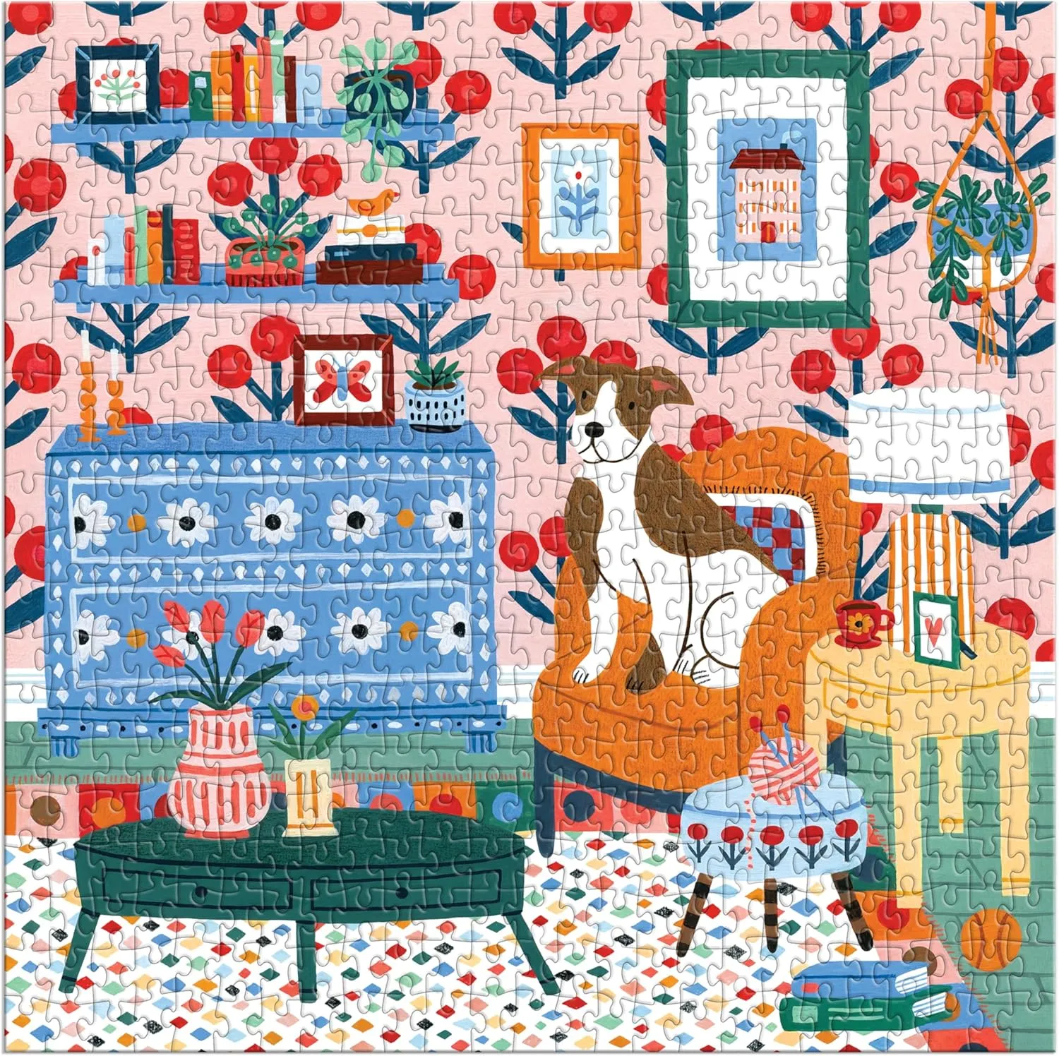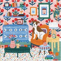 Relax and unwind with the Pattern & Petal 500 Piece Puzzle by Galison, featuring a cozy living room scene filled with vibrant patterns and textures. The illustration depicts a comfortable chair with a dog lounging, surrounded by playful, decorative elements that make this puzzle both inviting and fun. With every piece you fit together, you’ll reveal more of this charming, peaceful space, making it the perfect puzzle for anyone looking to relax and enjoy some quality time indoors.