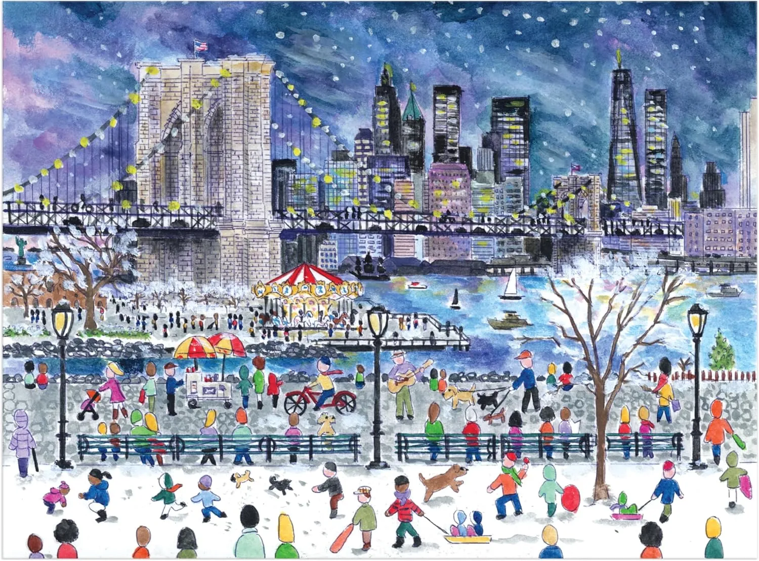 The Michael Storrings Brooklyn Bridge In Winter 1000 Piece Puzzle by Galison features a perfect snowy night under the Brooklyn Bridge In New York City.