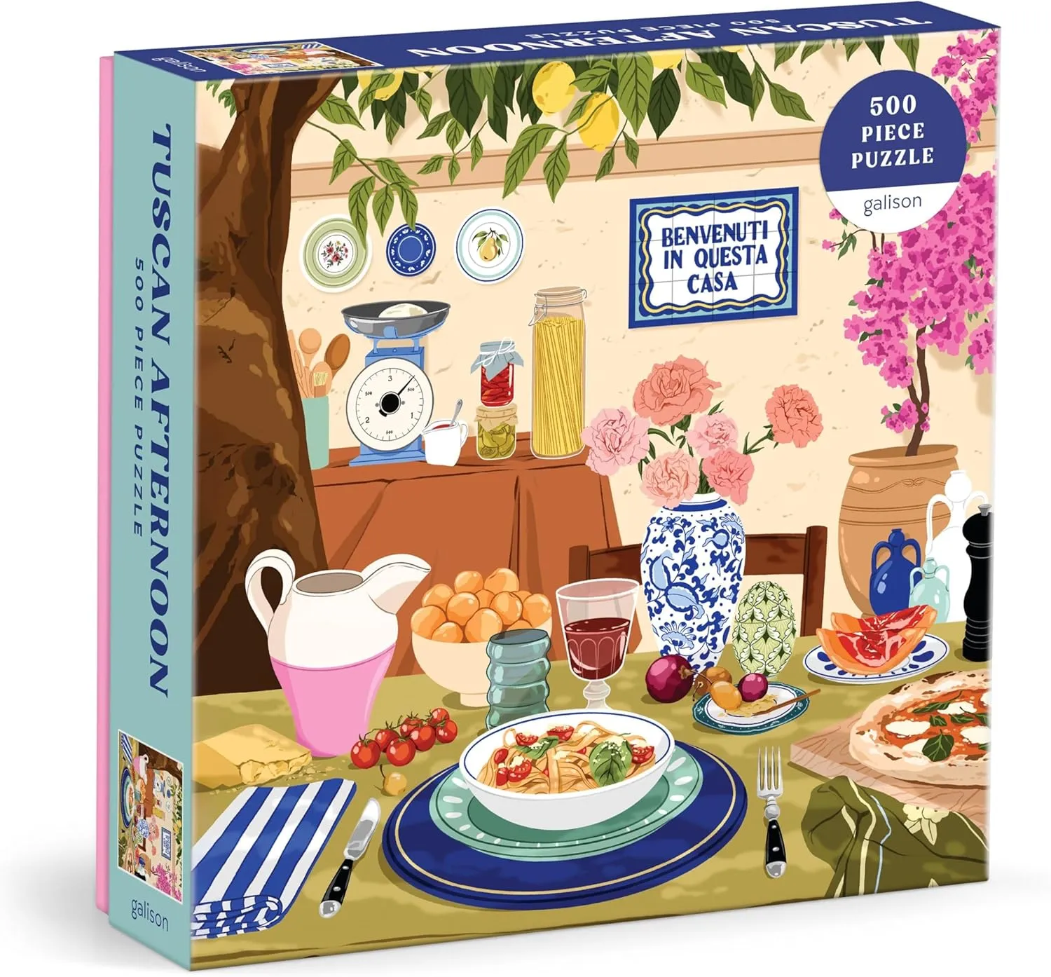 Transport yourself to the picturesque landscapes of Tuscany with Galison's delightful 500-piece puzzle featuring artwork of a Tuscan-themed dining table adorned with delectable Italian food. Each piece of this puzzle invites you to savor the rustic charm and culinary delights of an Italian feast amidst the rolling hills and vineyards of Tuscany.