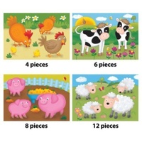 4 colourful puzzles, each with a different number of pieces to encourage development of matching and sorting skills. Four puzzles in each set with 4, 6, 8 and 12 pieces.