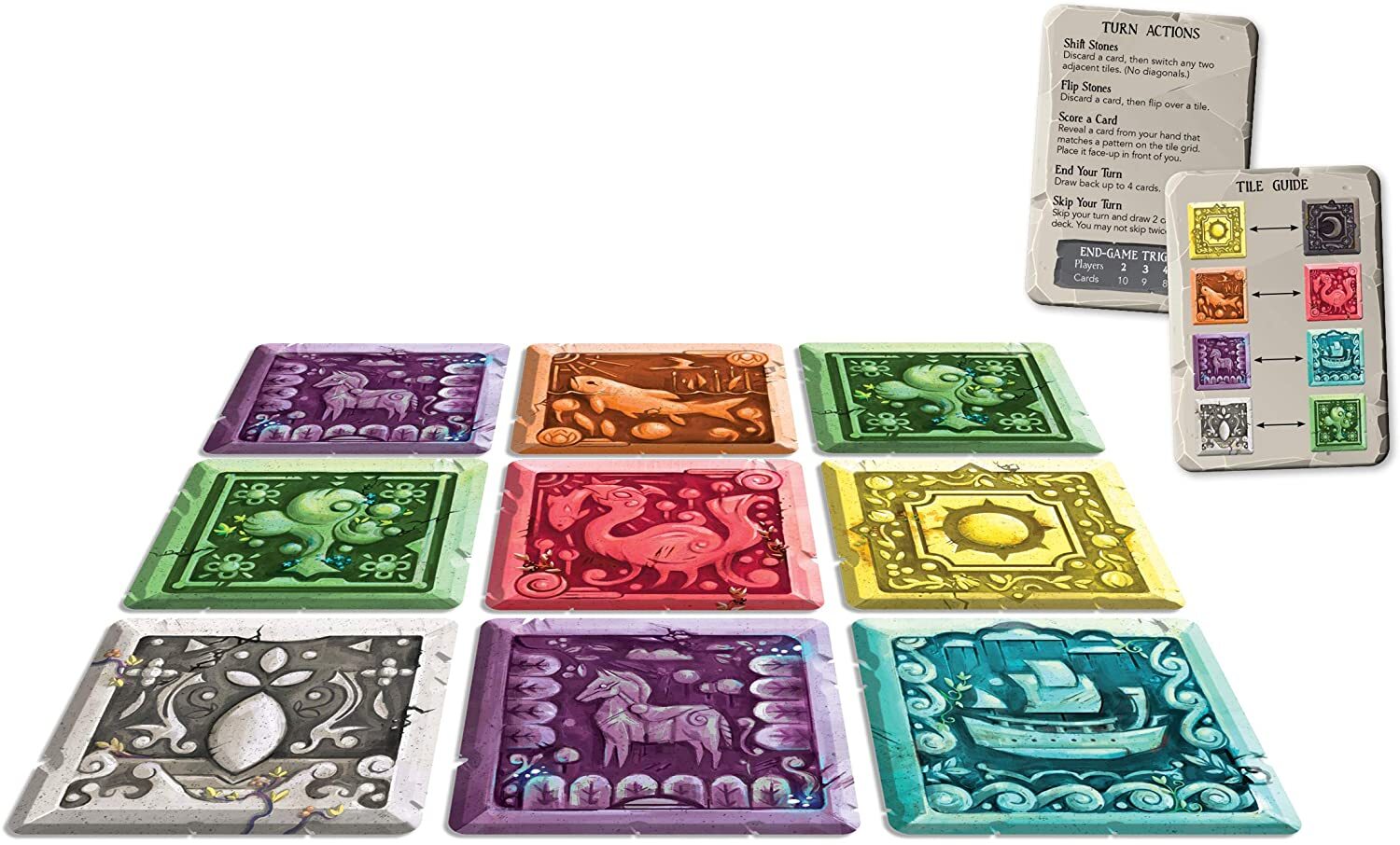 Leave no stone unturned! Nine mystical tiles lie before you in a grid of rocky ruins. A game of shifting strategy! Rearrange and/or flip 9 tiles to match patterns on your cards and score the most points by the end of the game. Each card may be used to manipulate the board OR score points, but not both! The game ends when one player has reached the designated number of points (based on total players in the game). Carve out the most points and your victory will be set in stone!