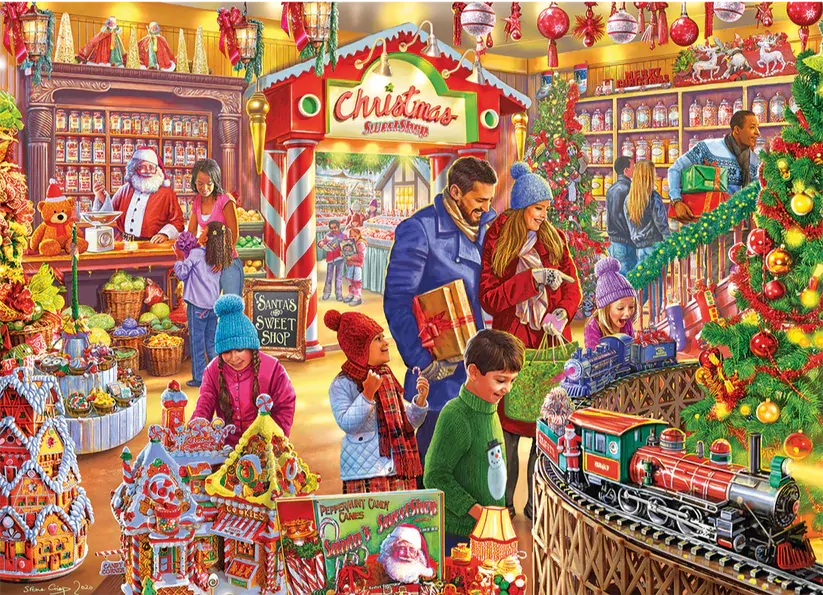 Visit Santa’s Sweetshop for some delicious seasonal sweeties in this beautiful 1000 piece festive jigsaw puzzle by Steve Crisp. The kids are beside themselves with joy as they browse the treats in Santa’s Sweetshop.