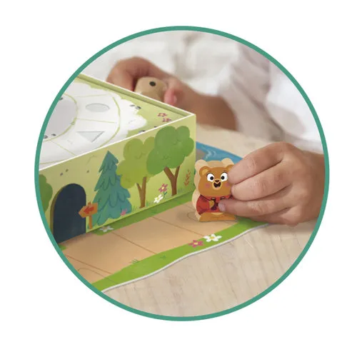 Goula Bear Adventure is a preschool board game designed for children aged 3 years and up. Players take turns moving one of four wooden characters across a 3D board, racing to be the first to reach the top of the mountain and conquer the flag. The game is educational, helping children learn different shapes, colours, and counting as they play.