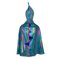 This reversible unicorn dragon cape is the ultimate dress-up item. Designed with bold bright colours of gorgeous aqua blue, lilac and pink, with shiny metallics and rainbow effects this cape is a winner. A bright dragon on one side equipped with protective scales from the hood all the way down the back, this cape turns into a soft fuzzy unicorn side with a faux fur mane and tail.