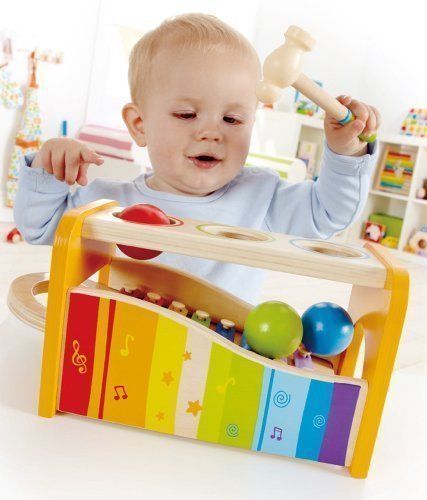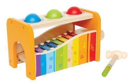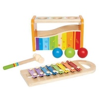 This combination of xylophone and hammer bench has easy grip handles, wooden balls and hammer. Xylophone can be pulled out and played separately.