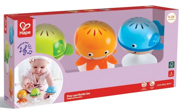 Babies will be enchanted by the Stay-put Rattle Set’s differing sounds, bright colours and aquatic animals. Moreover, with their handy suction cups, playtime is possible anywhere, anytime!