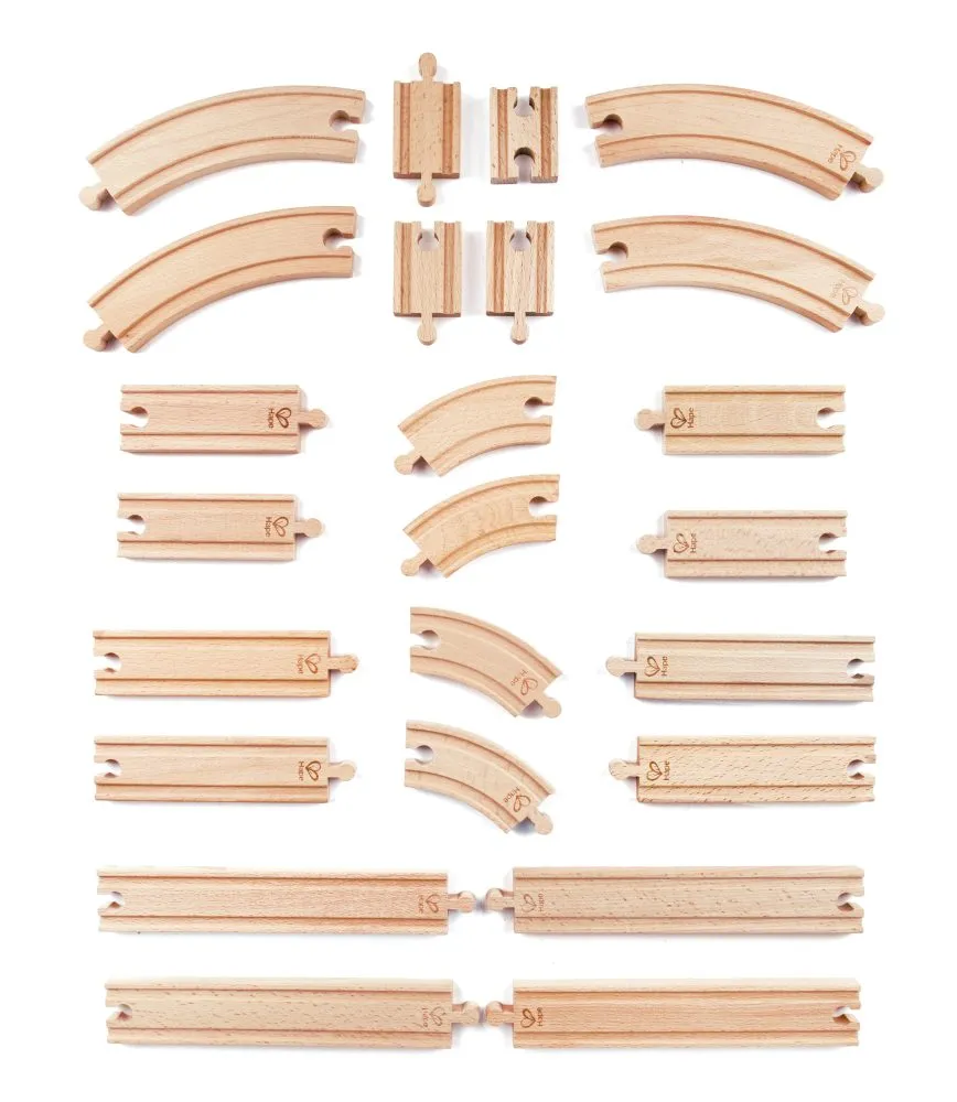 This wooden expansion pack includes 24 pieces with a variety of straight and curved tracks as well as some adapters. Compatible with all leading wooden train set brands.
