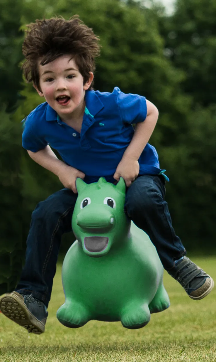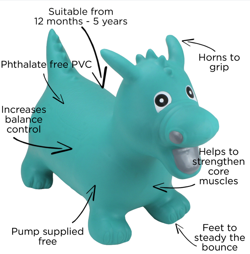 HappyHopperz are a collection of bright, inflatable animals that not only rival the space hoppers of the 1970's but take BOUNCING to a whole new level. This Green Dragon has a wider body for larger toddlers, ears to grip onto and feet to steady the bounce.