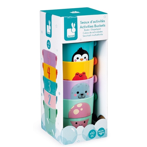 Encourage early concepts of first numbers and stacking with the 5 Activity Buckets from the Janod range of bath and water toys. Whether you use them inside or out, the buckets are numbered 1-5 to help children become familiar with numbers and 3 have different shaped holes in the bottom for varying rates of flow. Images of baby octopus, polar bear, penguin, lobster and seal are depicted on the opposite side to the numbers fostering colour and animal recognition. Stimulate development and curiosity with the 5 Activity Buckets from Janod.