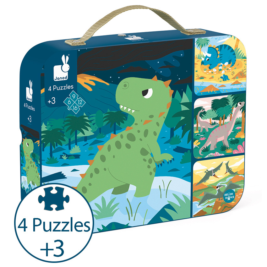 Visit the prehistoric age with the Progressive Puzzle Dino from Janod that includes 4 jigsaw puzzles. Start with the 6 piece and as your skills develop try the 9, 12 and finally the 16 piece puzzle, each getting a little more detailed as you go from the T-Rex through to the Pteranodons. Presented in the classic Janod suitcase with carry handle and press stud close, Dino is a charming puzzle that will encompass many skill levels and age groups.