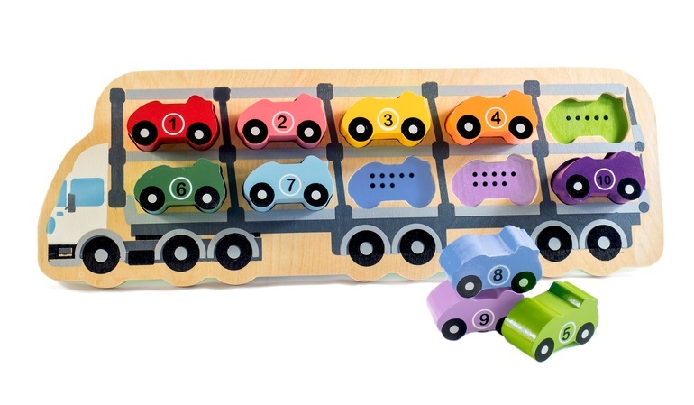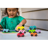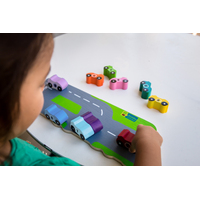 An educational puzzle which captures the attention of preschoolers who are strongly motivated to play with cars and trucks. It encourages the development of colour and number identification and also assists with hand eye-coordination. Match the number dots to the numbers on the cars or match the car colours to the colour on the truck.