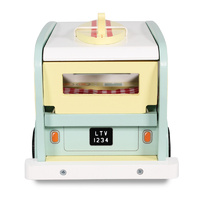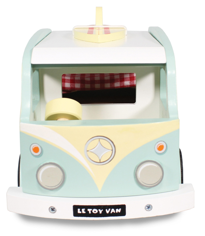 This vintage style wooden campervan toy is ready for mini adventures. complete with detachable surfboard and removeable roof. Campervan includes padded mattress and kitchenette area.