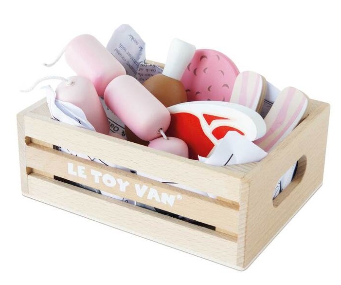 A wooden crate complete with the six pieces: sausage, steak, chicken, salami & two bacon pieces. Packaged with adorable Le Toy Van newspaper. A great role-play toy to inspire social play and offer the opportunity to discuss different food types.