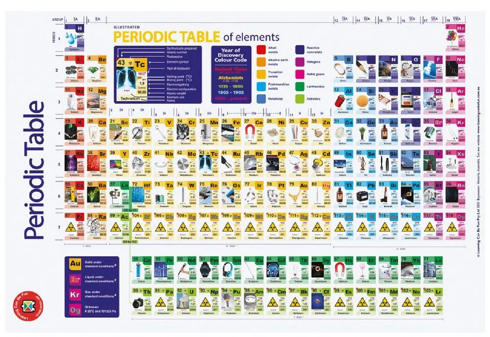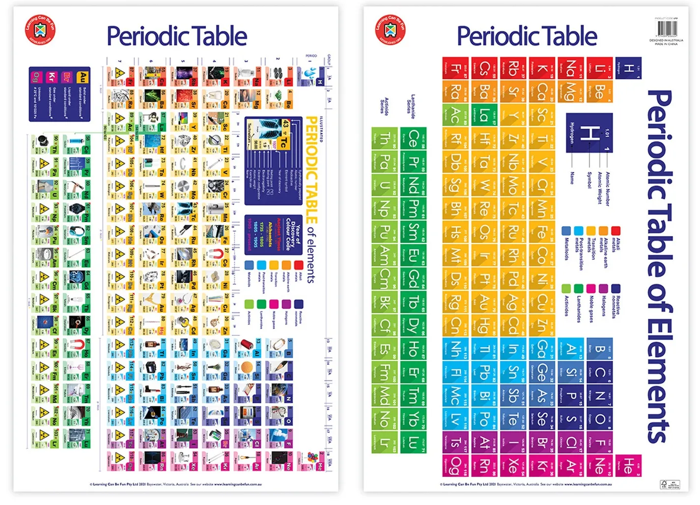 This colourful double-sided periodic table chart will be a great resource for any classroom or home with its easy-to-understand colour reference and legends. One side is illustrated with excellent images of where these elements are found in daily use, whilst the reverse has no images.