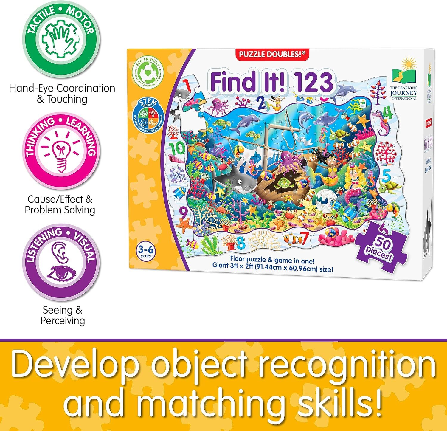 KEY FEATURES – The Puzzle Doubles! Find It! 123 includes 50 oversized puzzle pieces and measures approximately 91 x 61cm overall. Once assembled, it becomes a game to find the objects located on the puzzle’s border within the puzzle scene. Bright and colourful images of sea life and creatures adorn the jumbo floor puzzle and game.