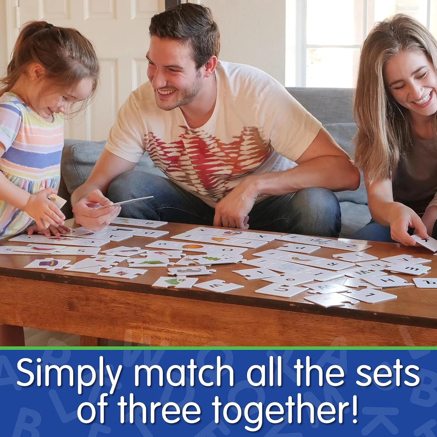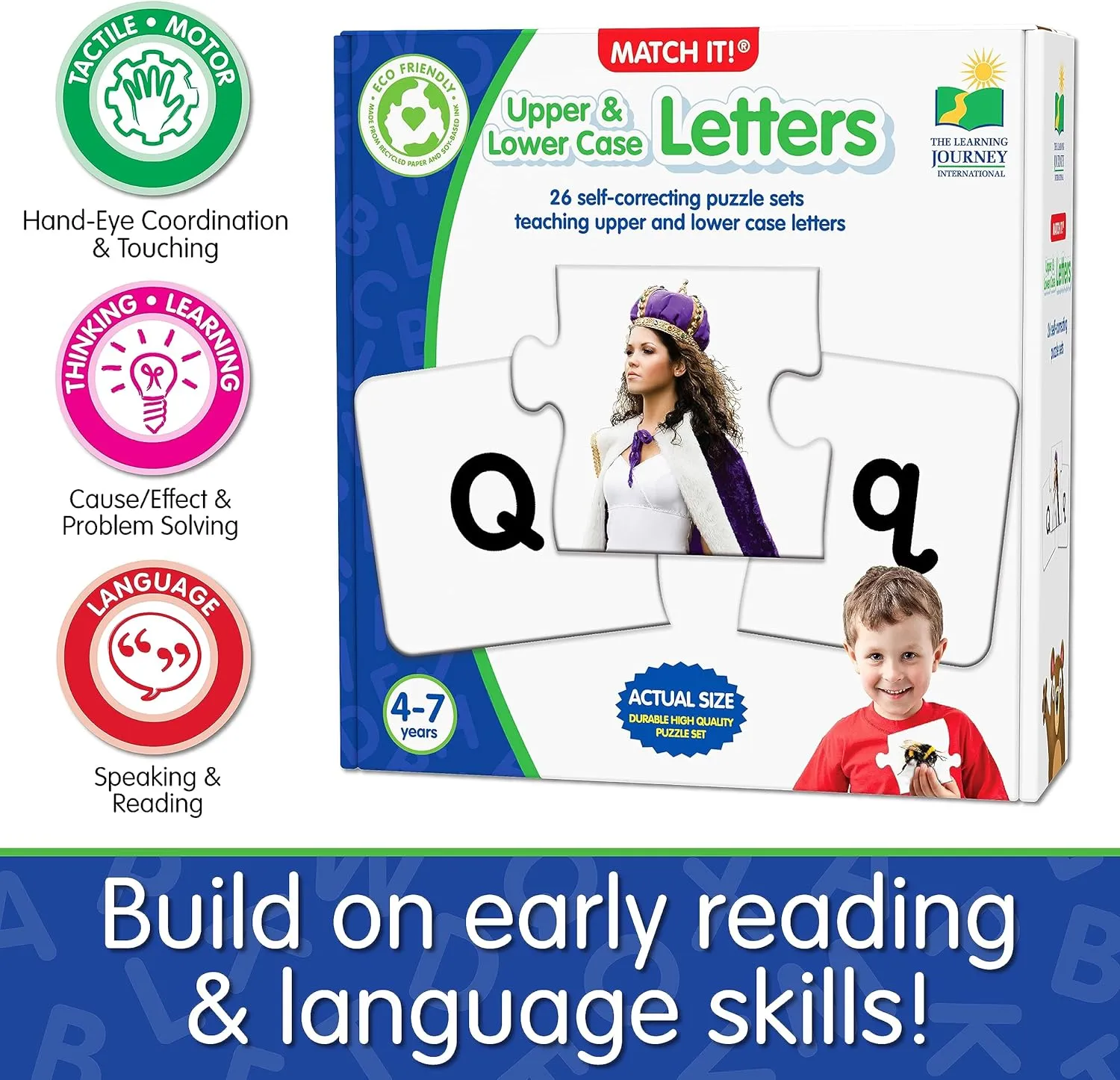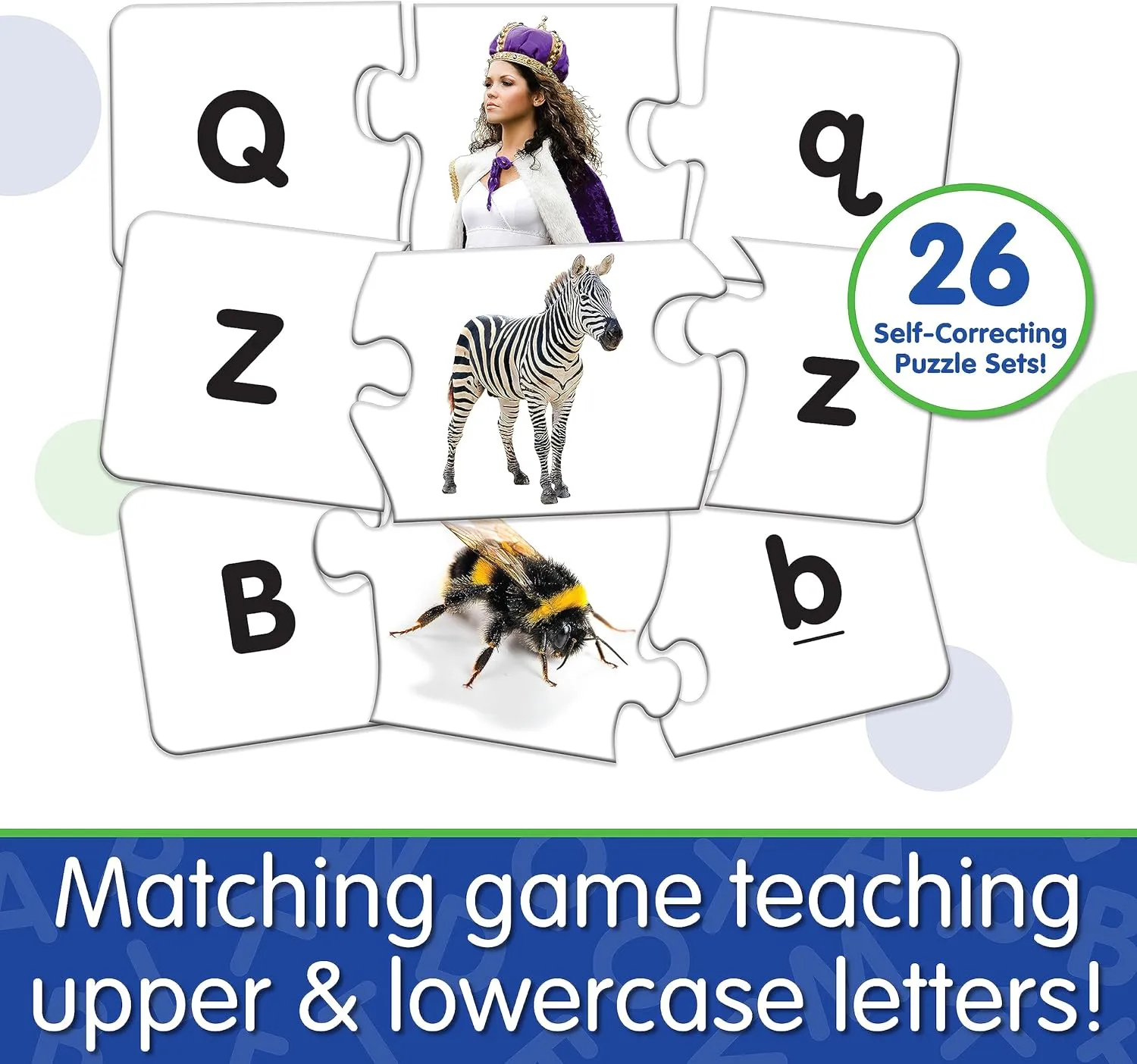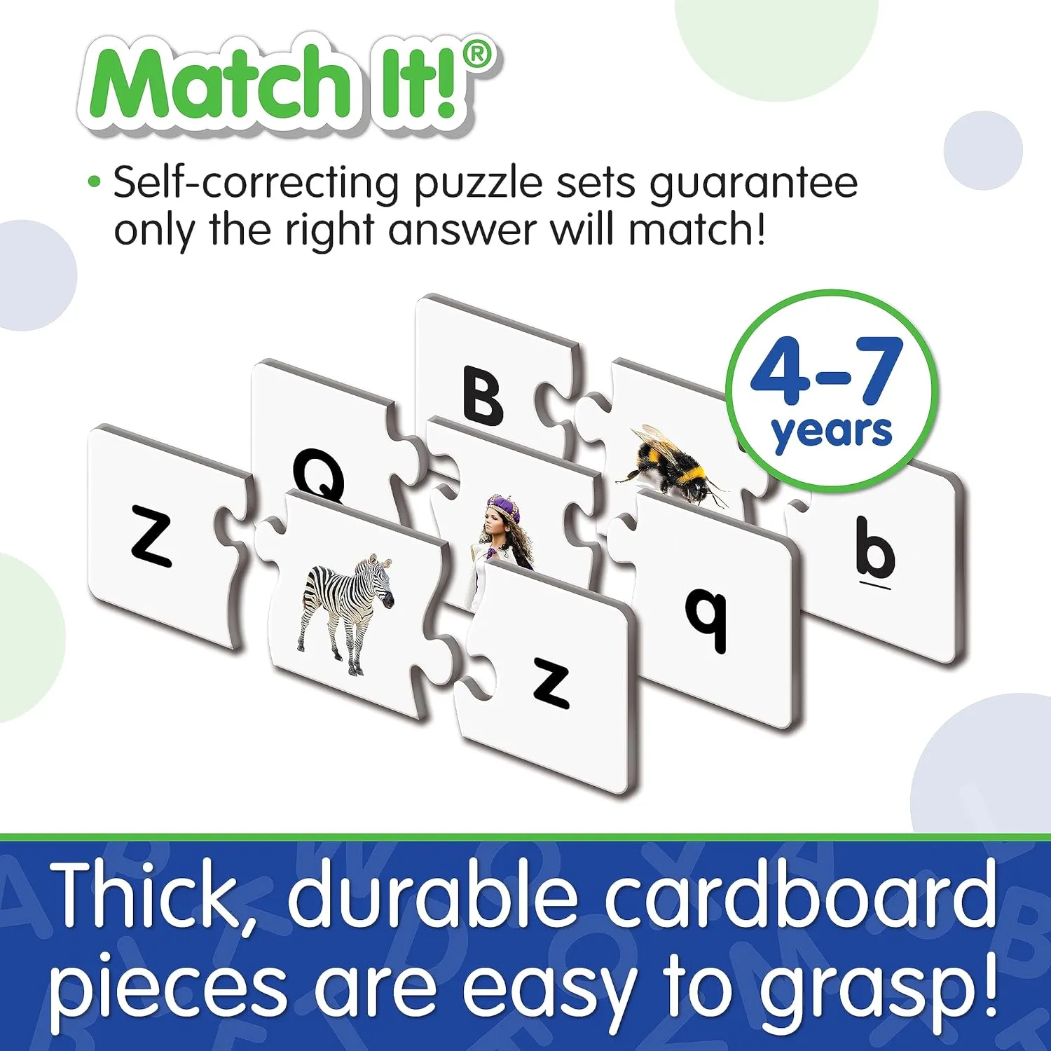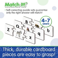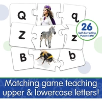 This colourful set of 26 letter puzzle cards provides children with a valuable way to learn their letters. Each card features the upper case letter, a picture of an object that starts with that letter and the lower case letter. Simply match the three pieces together to complete the puzzle. The puzzles are self-correcting as no two puzzle cuts are the same. It’s a fun way to learn about letters and to practice problem-solving.