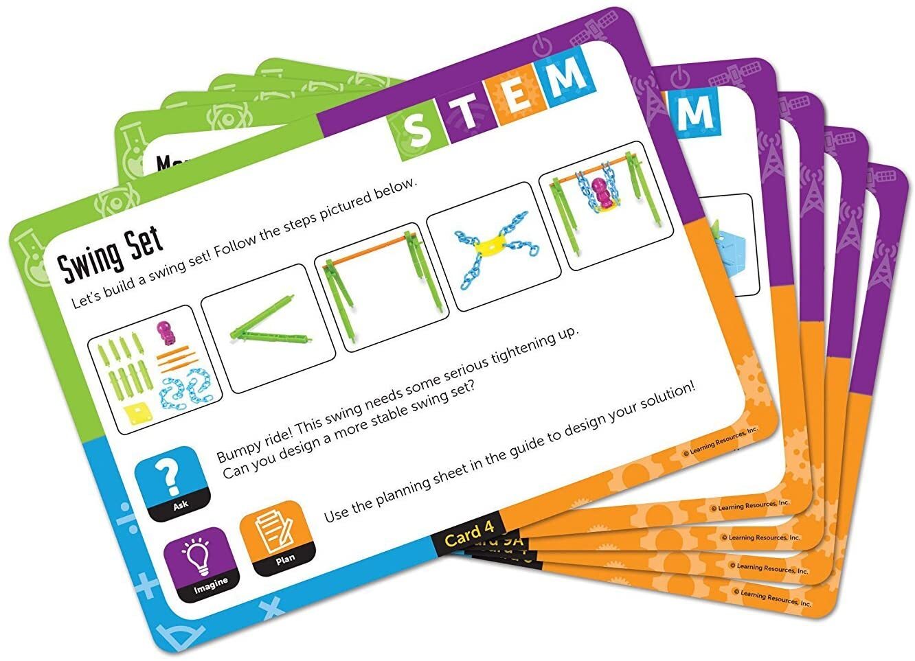 Encourage your child to come up with their own designs or they can follow the Challenge Cards, which include how to build different pieces of equipment on a playground (a twisty slide, a swing set, a seesaw, and more). Reproducible worksheets based on the engineering design process are included in the Guide.