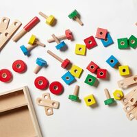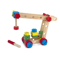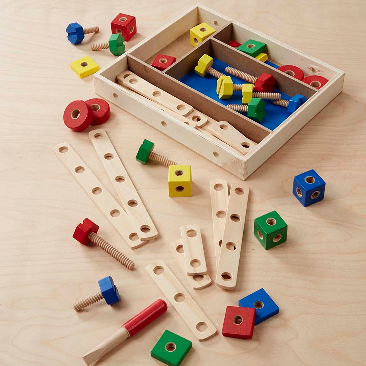 With 48 wooden pieces (including nuts, bolts, drilled bars to connect, and a child-size screwdriver), this classic building set gives kids all they need to tinker and build! Printed right on the sturdy storage box are building plans for a crane, motorcycle, airplane, and race car to get the fun started. With some imagination and a few creative twists and turns, kids can make hundreds more amazing structures too! Any time kids play with this durable set, they'll be building fine motor skills, problem-solving skills, and hand-eye coordination. Included extension activities guide parents to educational activities that also build early maths skills.