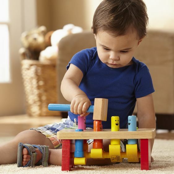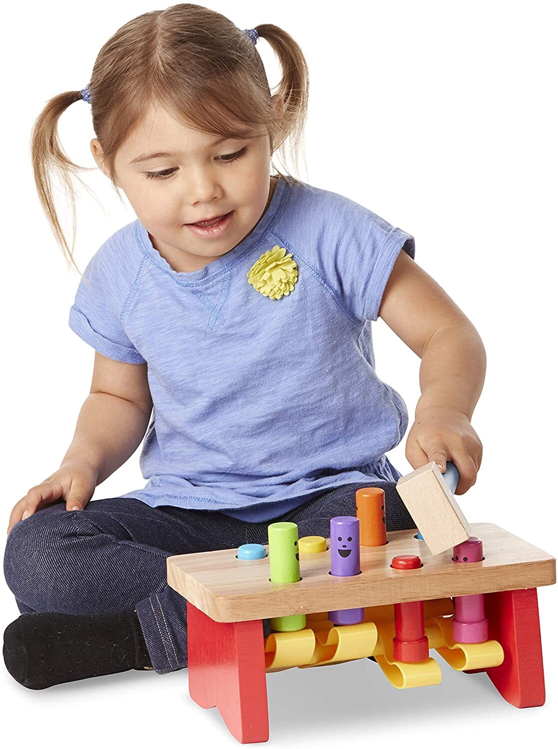 The pegs on the bench go up and down, playing peek-a-boo on this solid wood pounding activity. Non-removable pegs take turns showing their smiles while your toddler has fun naming the colours and enjoys practicing fine motor skills. A sturdy mallet is included.