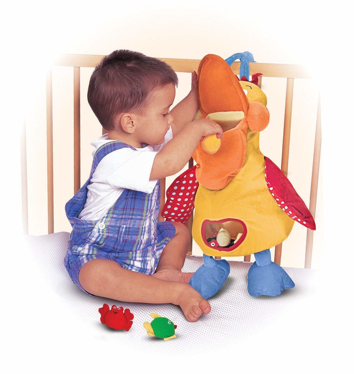 This cuddly plush pelican has an empty belly . . . and a big appetite for fun! Young children can open the pelican's big bill (which squeaks when squeezed!) to drop four mini plush animals into his open mouth. Then the crinkly shrimp, squeaking octopus, and rattling fish and crab drop right into the bird's big belly! A peek-in, reach-in window on the pelican's front lets kids spot them easily and pull them out to try it all again. The repetitive activity is great for babies and toddlers working on motor skills and other early developmental skills. And thanks to an incredible array of fun-to-explore features--from chubby, squeak-able cheeks to crinkly wings to floppy, rattling feet--it never gets old!