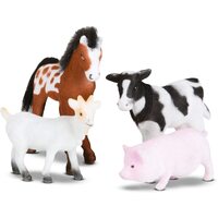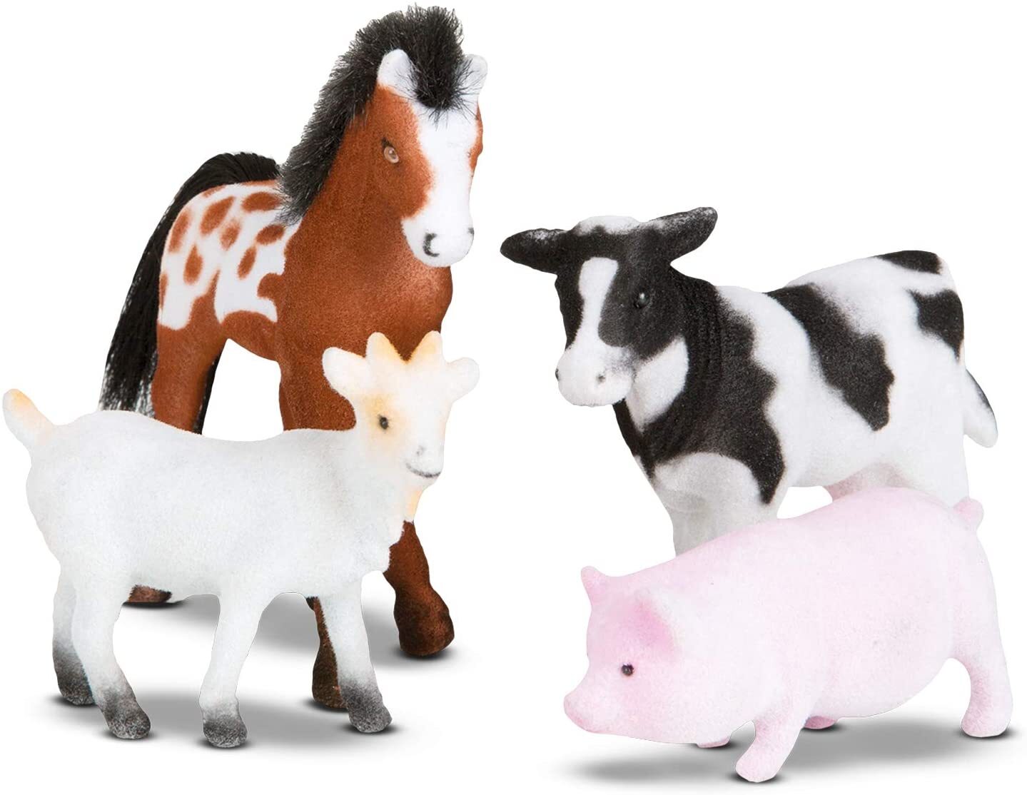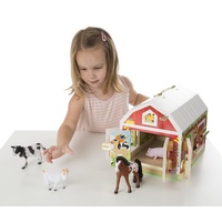 Unhook the latches to open the barn doors and see who is inside, then close the doors and buckle up the barn again! This beautifully crafted sturdy wooden barn is brightly painted both inside and out. It features six brass-hinged doors with working latches and locks, and pictures of farm animals on the inside of each door. There's even a brass handle on top to take the fun wherever kids go! The set comes with four approximately 7.5cm tall flocked play figures-- a cow, a pig, a goat, and a horse --that fit in the barn. Great for fine motor development, as well as colour and animal recognition; encourages creative play.