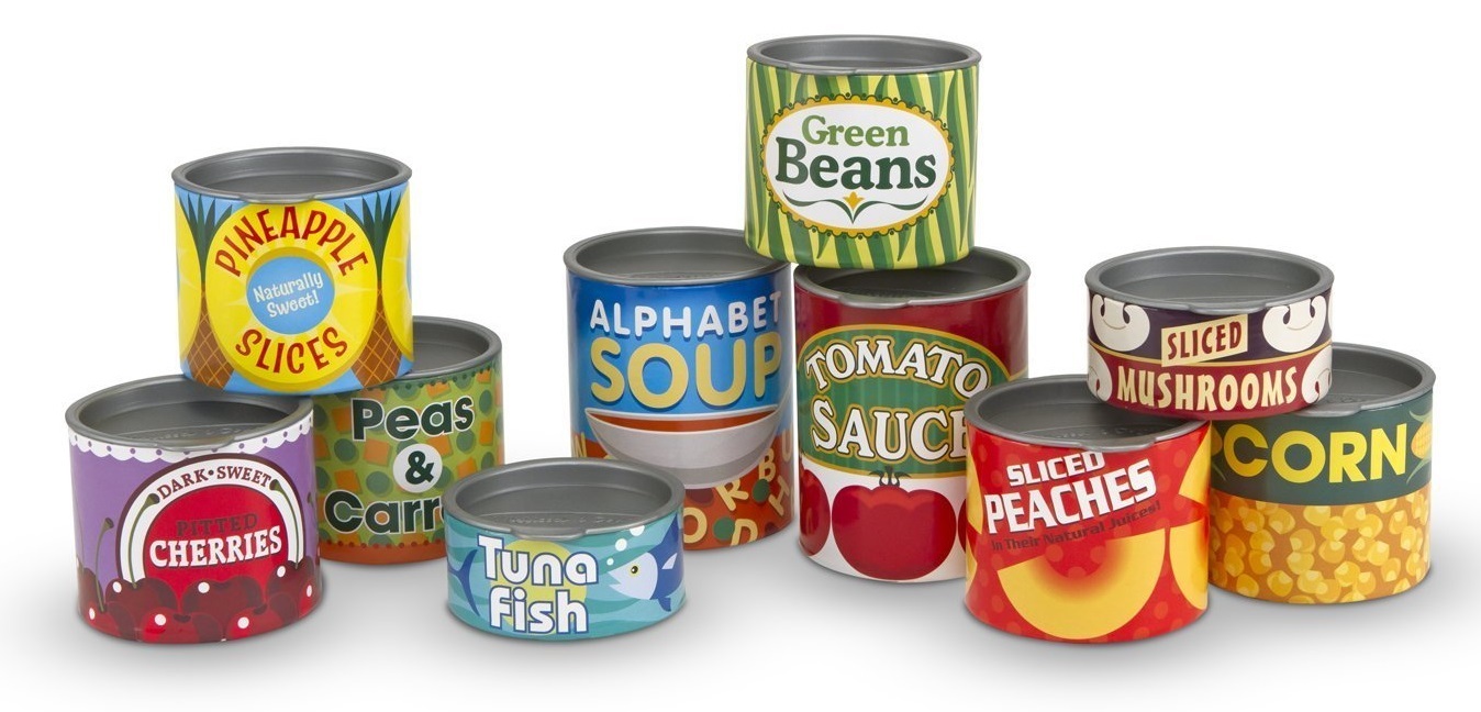 Stock a pretend pantry with this collection of lidded cardboard play-food cans and you'll have all the ingredients for colourful, imaginative grocery-store play. Open and close, fill and stack, sort and match the canned food toys--this set has a pretend-play flavour for every taste!