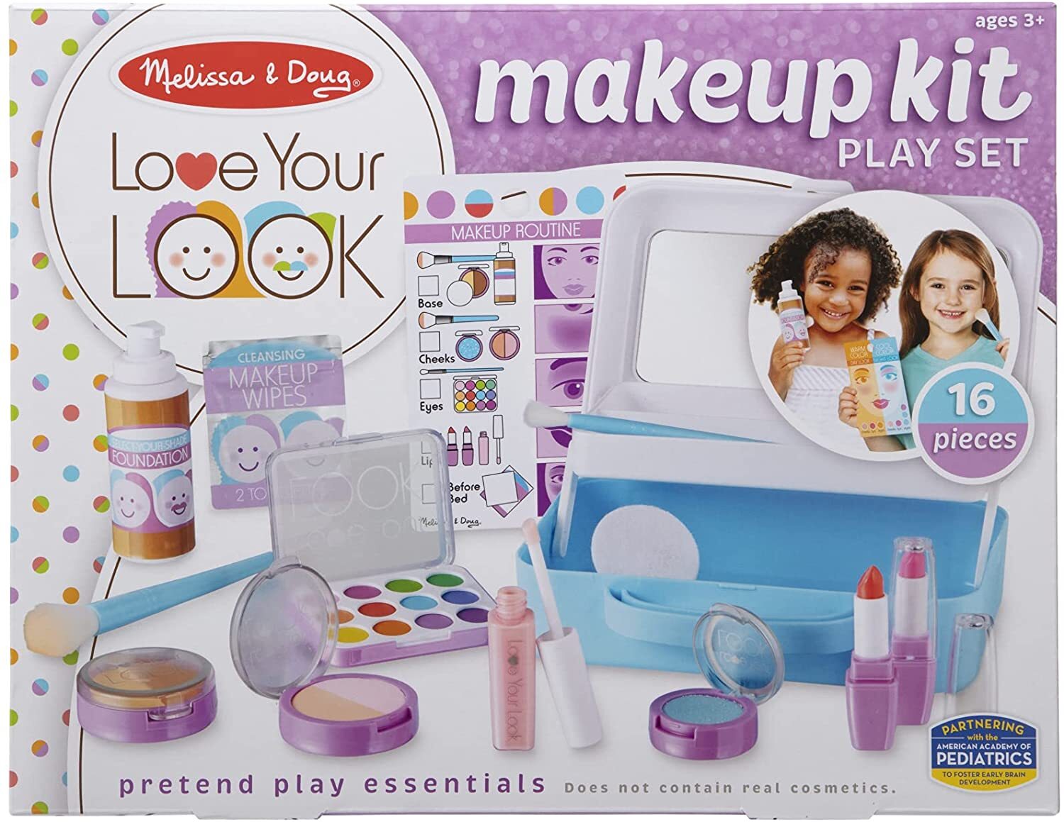 Perfect for mess-free imaginative play, this set does not contain real cosmetics. The 16-piece play set gives kids everything they need to play makeup artist and to practice daily skin care and makeup routines! Application brushes and play accessories for eyes, lips, and face, including an empty foundation pump bottle, compacts for pretend blush, powder, and glitter, pretend gloss and lipsticks, and a play eye shadow palette, let kids imagine different looks. Accessories look real but are toys--items do not contain cosmetics and no colour is transferred, giving countless hours of mess-free imaginative play! Everything, including 2 cloth makeup wipes in a resealable pouch and a reusable activity card, stores in a portable, durable makeup kit with built-in mirror!