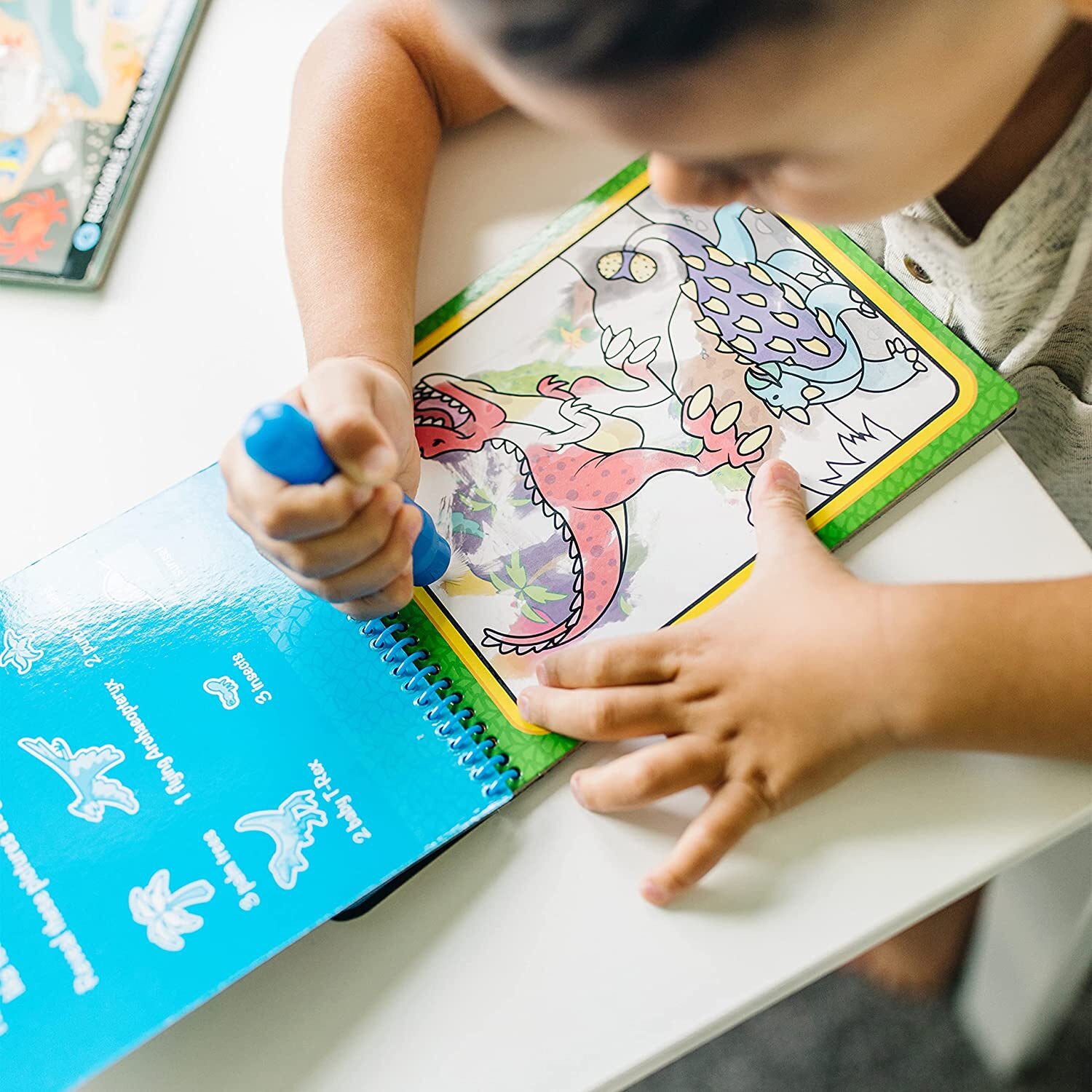 No-mess painting for kids! This exciting paint-with-water coloring book includes four reusable pages and a refillable water pen. Simply use the pen to colour in each scene—details and vibrant colour appear with every stroke! Then let the page dry to erase the pictures and colour it in again and again. This dinosaur-themed book includes four scenes to colour, and a search-and-find activity for each scene. The chunky-sized water pen is easy for kids to hold and stores neatly right in the front cover, making this Water WOW! an ideal travel activity book and travel toy for kids!
