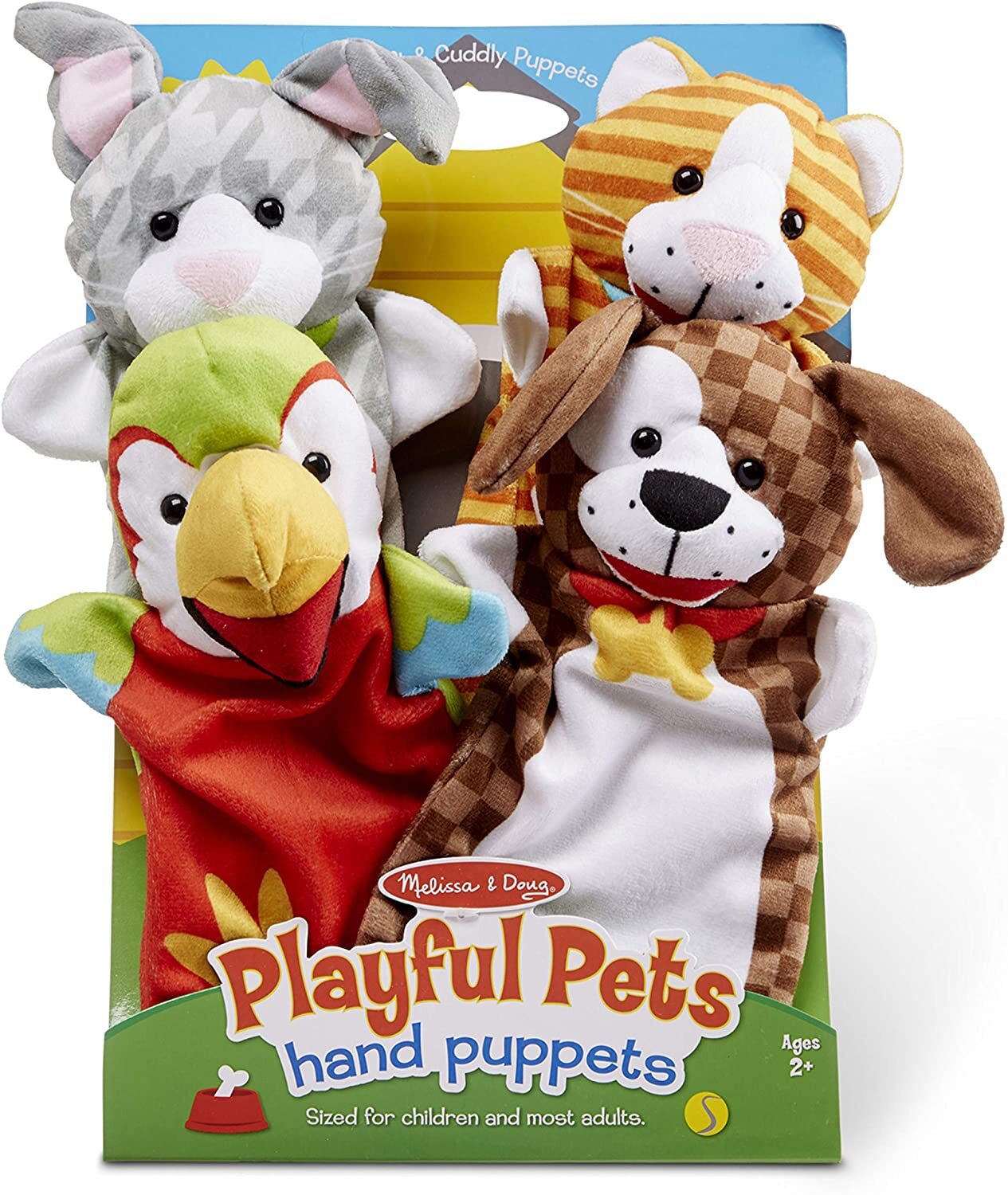 This four-piece hand-puppet set makes it easy for kids and adults to role-play together! Four simple glove puppets in a coordinated theme can act out a scene together, or be used separately for simple puppet play. Either way, they are great for developing dexterity, communication skills, self-confidence, creativity, and so much more! Made with brightly patterned, washable fabrics and built to last, these soft and sweet hand puppets are sure to be go-to toys for years to come. Playful Pets Hand Puppets includes a rabbit, parrot, kitten, and puppy.