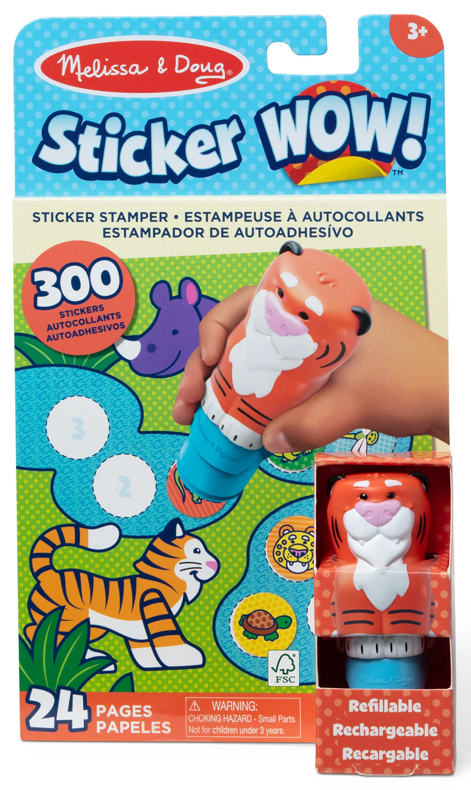Melissa & Doug Sticker WOW! is a whole new way to play with stickers! Let the adorable, collectible Pumpkin the Tiger stamp, stamp, stamp its way through 24 pages of fun-filled, safari-themed counting, matching, and search-and-find activities. The refillable sticker stamper comes pre-loaded with a sticker stack of 300 assorted stickers – with 100 unique designs in every stack, each sticker is a surprise!