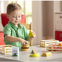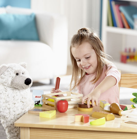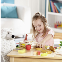 Planning a well-balanced meal is child's play with this wooden play food set. Items from the five food groups -- including watermelon, milk, cheese, fish, eggs, and much more -- are crafted of solid wood and come with four wooden baskets for sorting and storage.