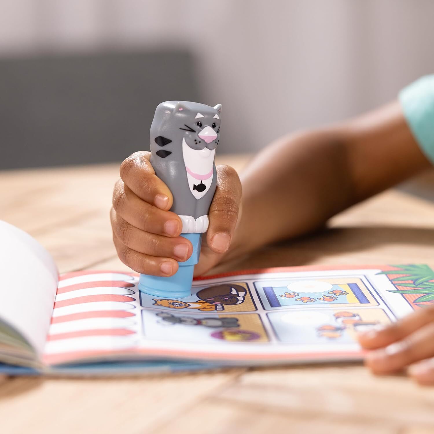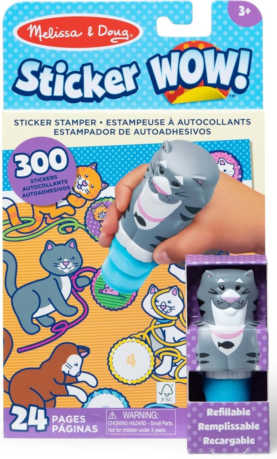 Melissa & Doug Sticker WOW! is a whole new way to play with stickers! Let the adorable, collectible Tuna the Cat stamp, stamp, stamp its way through 24 pages of fun-filled, pets-themed counting, matching, and search-and-find activities. The refillable sticker stamper comes pre-loaded with a sticker stack of 300 assorted stickers – with 100 unique designs in every stack, each sticker is a surprise!